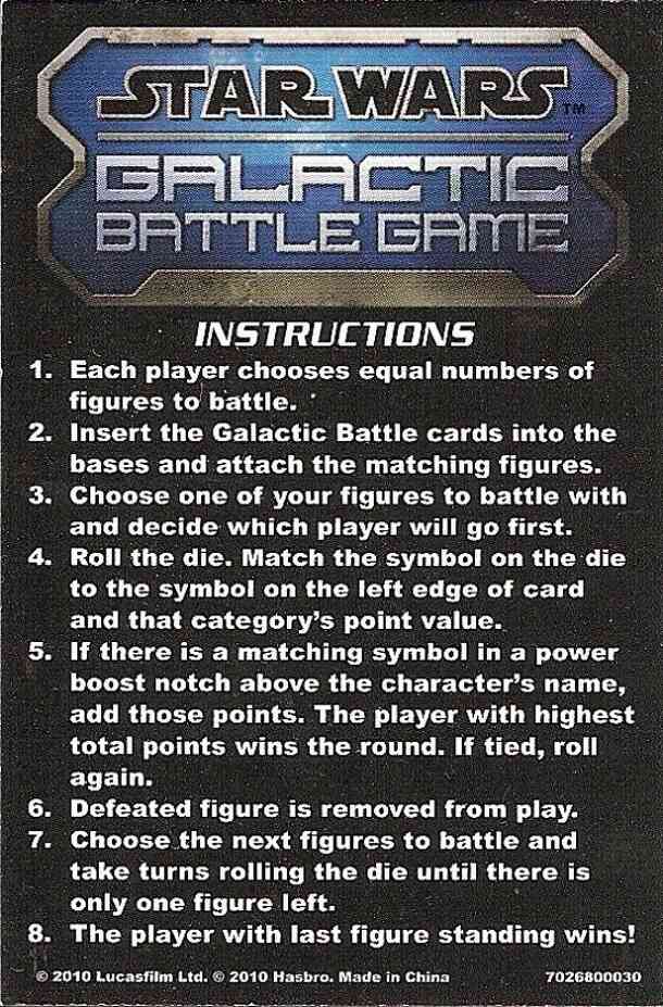 This game is a pack in with every Hasbro 3.75 inch Star Wars action figure. Each figure comes with a stat card with bonus powers, a base to hold the figure and the card and a die. The die is custom and has 6 Star Wars symbols on it. Make up your army of figures from as few or as many as you want. Pick an opponents figure to battle and roll the dice. The...