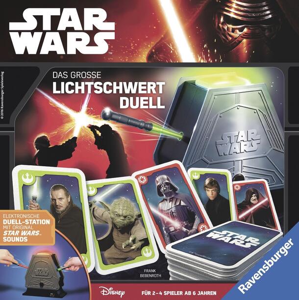 Players in Star Wars: Das große Lichtschwert Duell first need to collect either three different cards of the same side of the Force (Light or Dark) or collect three identical cards. Once they do this, they lay down the cards and challenge an opponent to a duel. To duel, you press a button on an electronic device, then wait for the blue light on top of the...