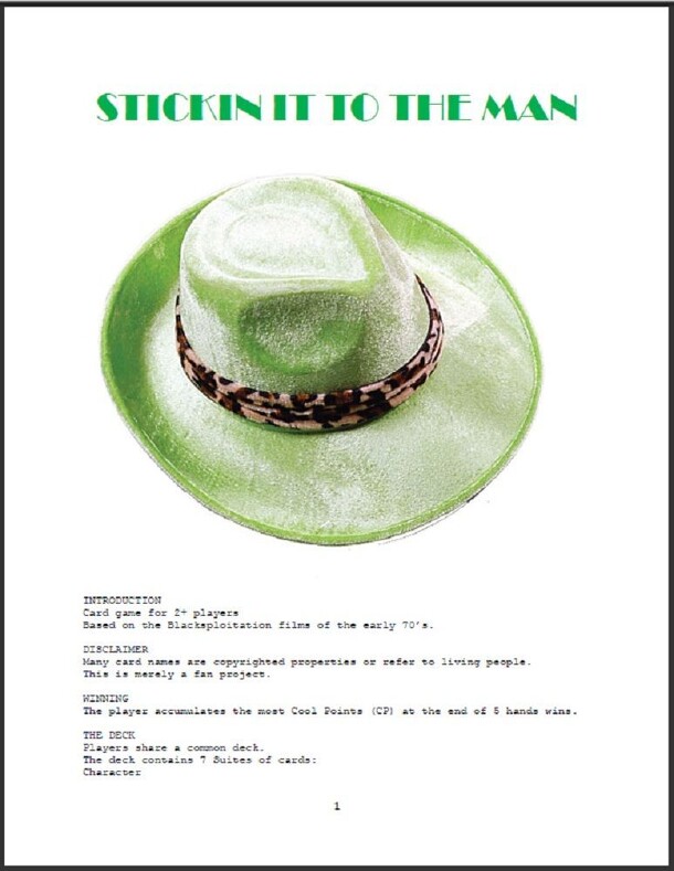"Card game for 2+ players. Based on the Blacksploitation films of the early 70’s. Winning: The player accumulates the most Cool Points (CP) at the end of 5 hands wins." The game is played with a custom deck containing seven suits of cards: Character, Cool, Fighting, Accessories, Bad Guys, Musician, and Actor. Each card is valued at 1 to 10 Cool Points....