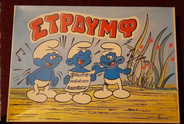 A Smurfs themed board game, made in Greece in the early 80's. It can be played from to 2 to 4 players. There is no dice, instead there is a wheel with numbers. Each player in his turn spins the wheel, and moves in the board the exact spaces, as the number you have in the wheel. There are some spaces on the board, where when you reach them you have to pick...