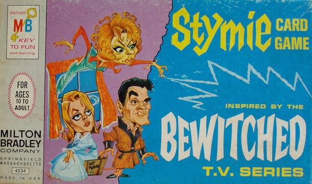 Stymie Card Came. Inspired by the Bewitched T.V. Series. Milton Bradley #4534. Game parts include 42 playing cards (27 number cards: 0,1,5,& 10 and 15 picture cards 5 each Samantha (+), Endora (-) and Darrin (X)). There is also a heavy paper mat with areas marked out for the placing of the card sets. The object of the game is to complete two combinations...