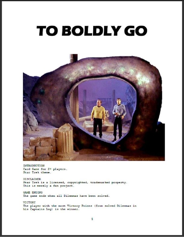 "Card Game for 2+ players. Star Trek theme." The game is played with two custom card decks - the Crew Deck and the Dilemma Deck. The Crew Deck cards represent crew members, actions and equipment. They are used to solve Dilemmas. Cards have ratings for one or more of the following attributes: Tactics, Science and Negotiation. The Dilemma Deck cards...