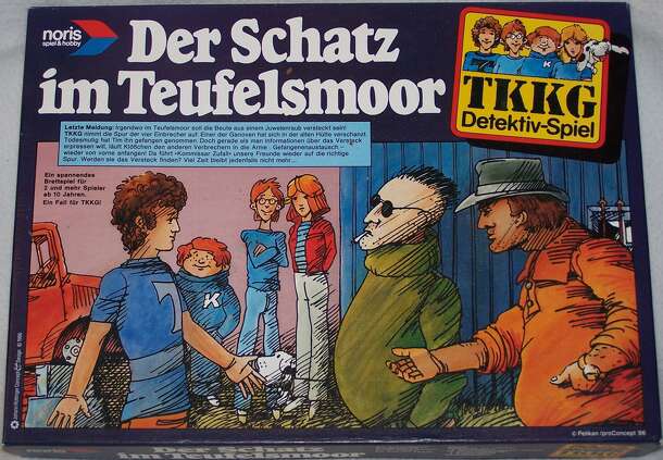 The TKKG - the gang, which consists of the kids Tim, Karl, Kloesschen and Gabi - are looking for a stolen treasure, hidden in the "Teufelsmoor" by the burglars. While TKKG tries to find the treasure as soon as possible, the burglars try to stop them. The game consists of a board, divided into several bigger and smaller areas, 8 cardboard figures (4 for...