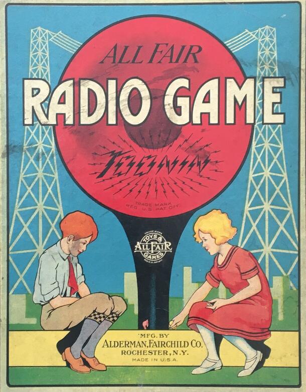 This mid-1920s game can be used in two ways. The board has six concentric tracks, one per player, each named after a popular radio set or circuit brand: Neutrodyne, Armstrong, De Forest, Crosley, Radiola and Super-H. There also are six D6, marked with the starting letters of the six brands. The board is divided radially into 16 spaces, each with the call...