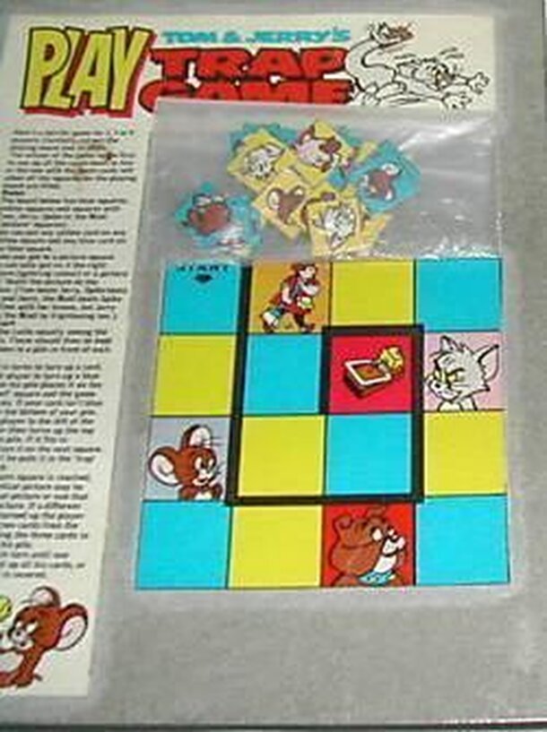 The game is set on a gridded board seeded with face-down cheese and cat tiles. Each player begins in a designated corner and in order to win must a) cross to the opposite corner and b) collect two cheese tiles along the way. They are also in danger of turning up Tom tiles which force them to replace a cheese tile face down on the board, or failing that...
