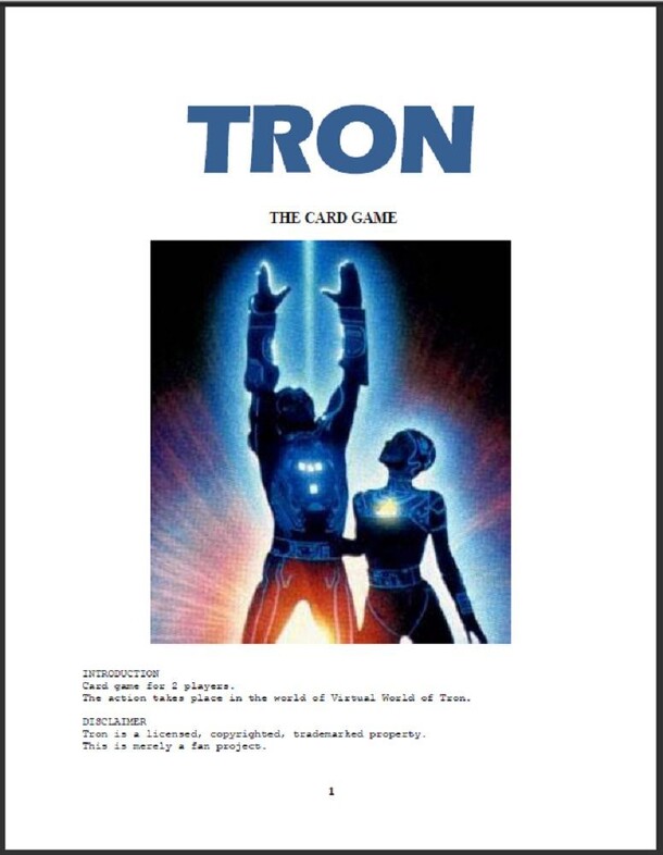 "Card game for 2 players. The action takes place in the world of Virtual World of Tron." One player represents Tron and the other plays as the Master Control Program or MCP. Each player uses a separate custom deck of cards. The Tron deck is made up of six types of cards: Programs (Characters), Skill (used to defeat Games and Security), Escape (used to go...