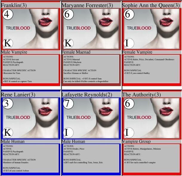 User Summary: Fan-generated card game inspired by the True Blood books/HBO series. Players work to control a number of different characters (human, vampire, werewolf, etc.) and use those characters' special abilities to control others and gain Blood Tokens. Whomever collects the most Blood Tokens by the end of the game, wins! (Note: The game cards contain...