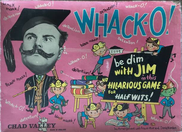 This is a silly spin-and-move game where schoolboy players and their catapults must try to get from top of the First Form (average IQ) to bottom of the Fourth Form (Half-Witted) while collecting as many Black Marks, Detentions, and Whack-Os as possible. Players may have their catapults confiscated (and must pay 3 points worth of cards to get them back in...