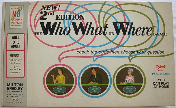 Players are given a category, then secretly bid from $5-$50 of their winnings on their ability to answer one of three questions (Who, What or Where). Easy questions pay even money, harder questions can pay up to 4:1. Only the highest bidder gets to play, and if there's a tie, players tying bid back and forth, and can wager up to their entire stake. The...