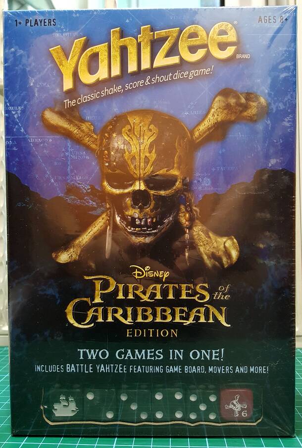 This game combines Yahtzee and Battle Yahtzee under the movie theme of Disney's Pirate of the Caribbean. In Battle Yahtzee version, each player starts as one of the captain from the franchise. They receive a card that illustrates the captain and provides a special power (each captain has a different one) to be used during the game. From the publisher's...