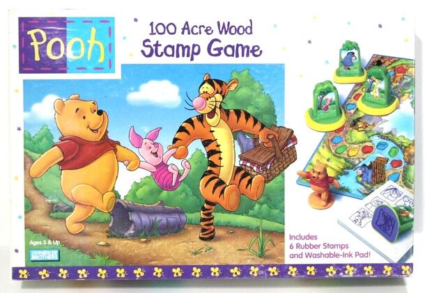 Based on Disney's Winnie the Pooh this game consists of a board representing the Hundred Acre Wood, six rubber stamps of each of Pooh's friends and a deck of cards. Players draw cards to determine movement around the board. If they land on one of Pooh's friends houses they get to put that stamp on the appropriate spot on their score sheet. The score sheet...