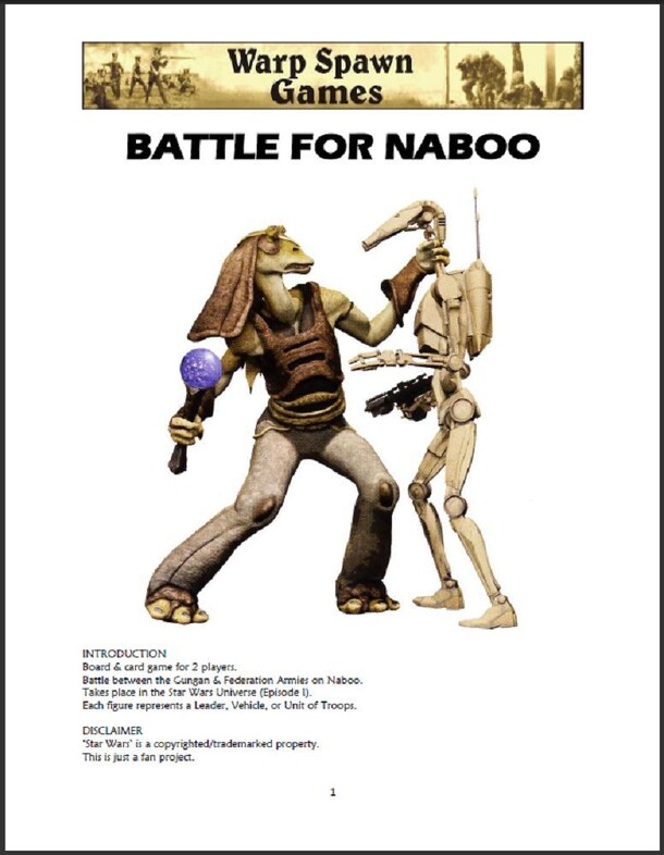 “Battle between the Gungan & Federation Armies on Naboo. Takes place in the Star Wars Universe (Episode I). Each figure represents a Leader, Vehicle, or Unit of Troops. Victory: If the Shield Generator Beast is destroyed, the Robots win. The game ends automatically after you go through the deck twice when young Anakin destroys the Federation Carrier Ship...