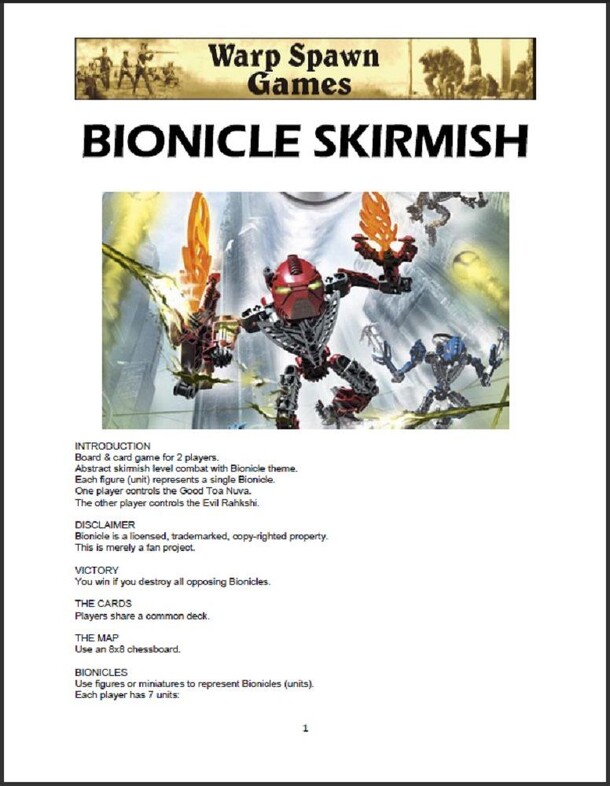 This is an abstract, skirmish-level combat with Bionicle theme. Each figure (unit) represents a single Bionicle. One player controls the good Toa Nuva. The other player controls the evil Rahkshi. You win if you destroy all opposing Bionicles. Bionicle Skirmish is played on an 8x8 grid. Miniatures or counters are used to represent the combatants. Both teams...