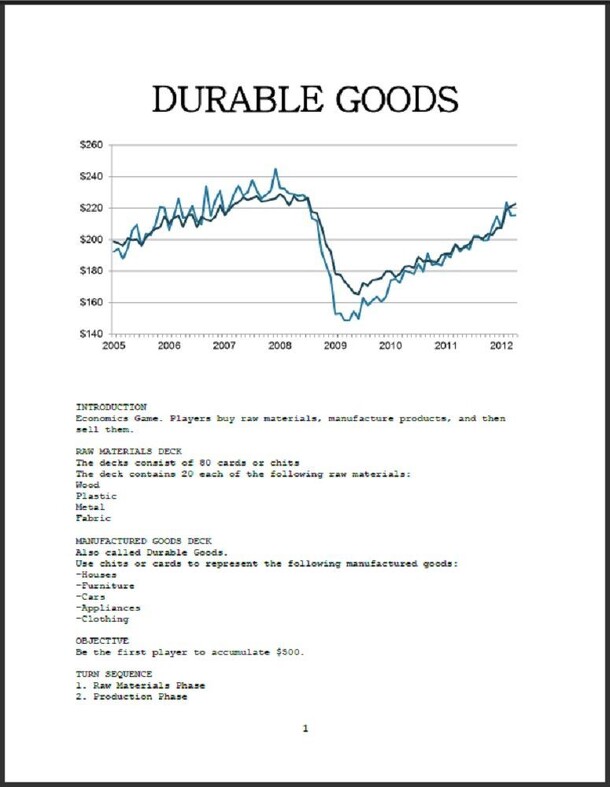 “Economics Game. Players buy raw materials, manufacture products, and then sell them. Each player starts with $50 and no raw materials or products. Raw Materials Deck: The decks consist of 80 cards or chits. The deck contains 20 each of the following raw materials: Wood, Plastic, Metal, Fabric. Manufactured Goods Deck: Also called Durable Goods. Use chits...