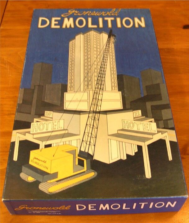 The object of the game is to raze and remove an eight story building of ones' opponent, and be reimbursed by City Hall for the completed demolition work. Each player is given a square on the board and 32 colored blocks. Each constructs an eight story building using all of the blocks within the designated area on the board. Die rolls determine which draw...