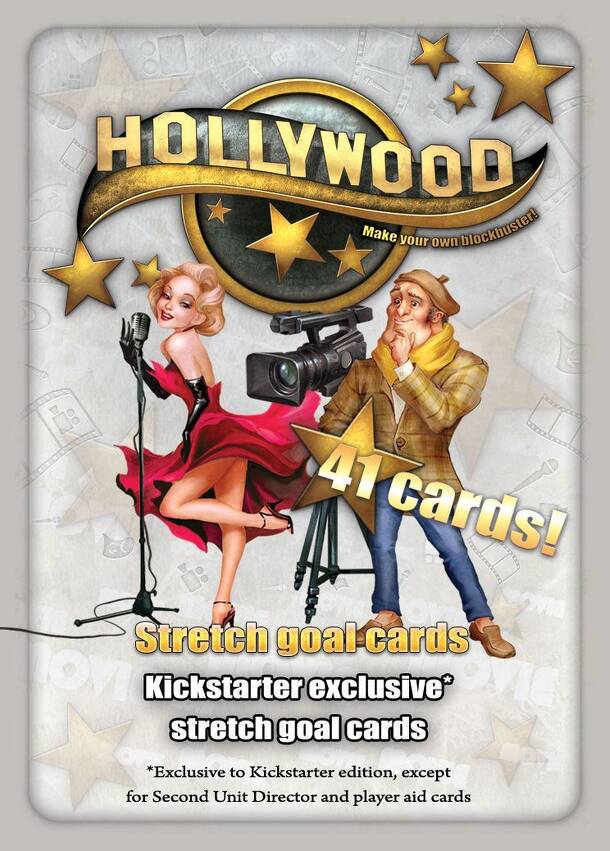 41 new cards for Hollywood unlocked with stretch goals of the Kickstarter project. Most of these cards are Kickstarter exclusive. Contents: PR Specialist (2), Lawyer (2), Method Acting Teacher (2), Singer (2), Gaffer (2), Dance Choreographer (2), Movie Critic (2), Actress / Director (2), Actor / Director (2), Actor / Actress (2), Director of Photography...
