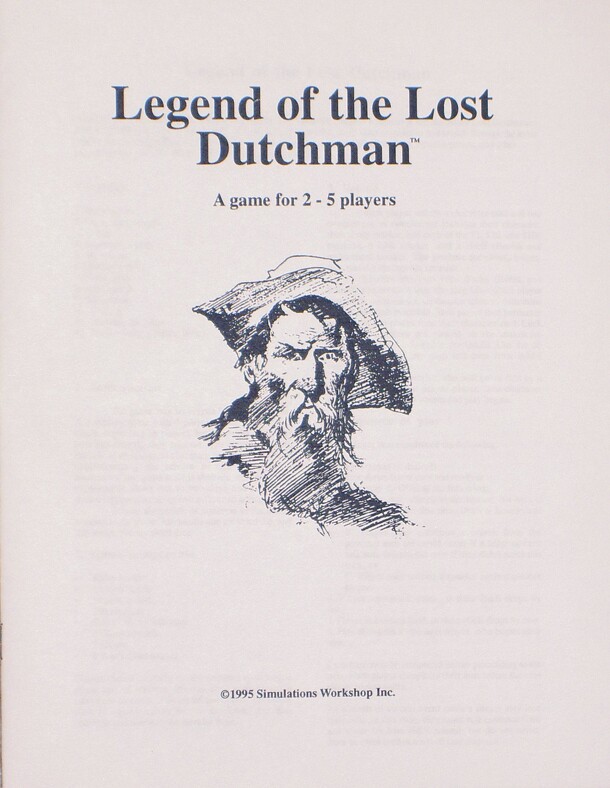 A game of the 1890's Arizona Territory, where 2-5 players compete to discover the legendary Lost Dutchman gold mine. Players must outfit their expedition and search through the most rugged terrain imaginable, while avoiding rattlesnakes, thirst, extreme heat, bandits, Apache guards, and other player's greed. One 11 by 17 inch parchment map of the...