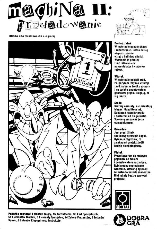 "Machina II: Przeladowanie" is a re-edition of very popular game called "Machina" published in 2002 in Poland. Every player is an Engineer working on his unique prototype. The aim of the game is to construct your own prototype using particular Elements (tiles) listed on your Prototype Card. Lack of Elements in game makes players steal and sabotage each...