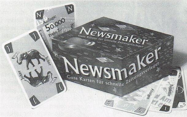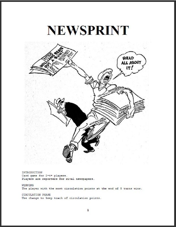 "Card game for 2-4+ players. Players are reporters for rival newspapers." Cards are played from a hand of ten to form news stories. Circulation points are awarded based on how many cards can be used to form the story - from one card (one circulation point) to ten (one hundred circulation points). "The player with the most circulation points at the end of 5...