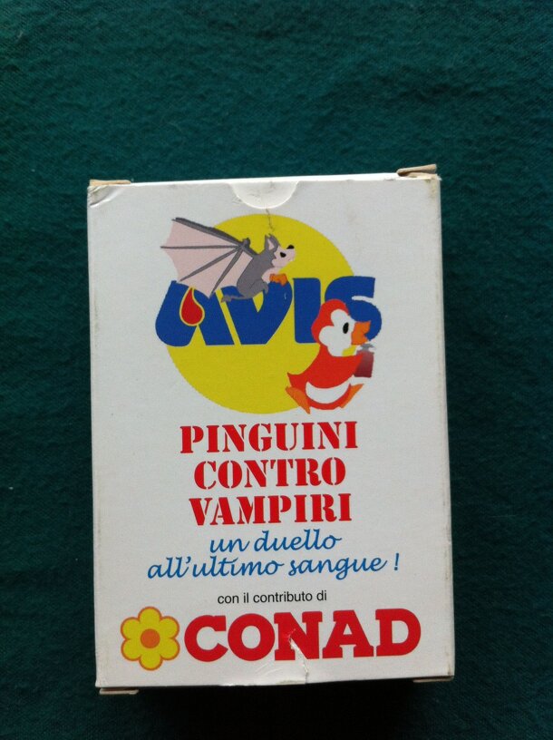 Presented at Play 2008 in Modena (Italy), Pinguini Contro Vampiri is a very simple game with rules similar to Uno. The game was sponsorized by AVIS (Associazione Volontari Italiani Sangue), the most important Blood Donors association in Italy, and the objective of the game is educate children to the importance of blood groups. It contains 55 cards: 48...