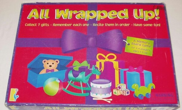 This is a memory game for children age 4 and older. The players travel around the board collecting gifts. The cards matching each gift are placed in a plastic rack in front of the child... but the kids turn the cards away so only the other players can actually see the images. The first player to collect seven gift cards and name them correctly in the...