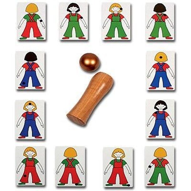 The players draw cards, stand one behind the other and put one hand on the person in front as shown in the cards they drew. The first player picks up the wooden baton and ball standing in front of him/her and carefully passes it on to the next player. If the baton and ball arrive at the last player everyone has won that round of the game. Fun and skill are...