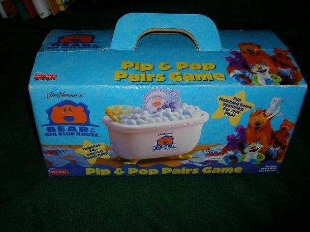 Pip & Pop Pairs Game is a variation on the classic game Memory based on the Disney TV series Bear and the Big Blue House characters Pip and Pop, twin otters. There are a series of 14 cards with pictures on them that are placed face down, then you "draw" a card via a spring-loaded bathtub card dispenser to try and match with the face down cards. Match the...
