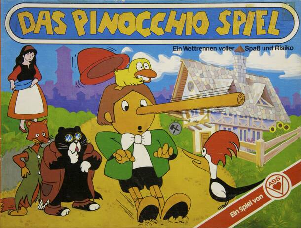 The board, at first glance, looks like a Monopoly-type track but it isn't. This is a fairly traditional 'get to the end of the track' game. Each player represents Pinocchio and receive 15 gold. You must start at the Carpenter's Shop and aim to arrive at the Cottage of the Talking Cricket. Movement is dictated by a spinner. If the spinner instructs you to...