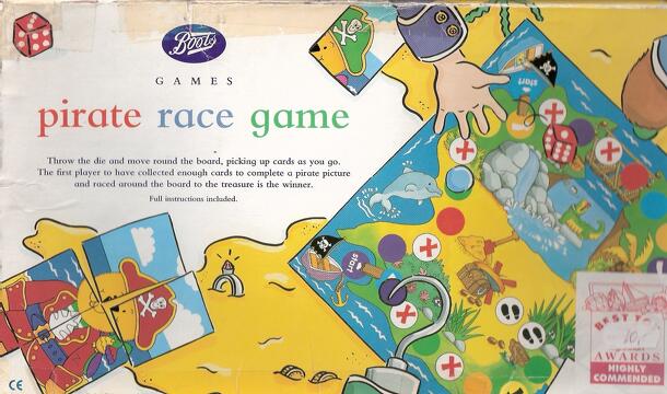 From the publisher: Throw the doe and move round the board, picking up cards as you go. the first player to have collected enough cards to complete a pirate picture and race around the board to the treasure is the winner. Content: 1 board 24 pirate cards 4 counters 1 die The skills being developed at this age include: counting skill co-operative play...