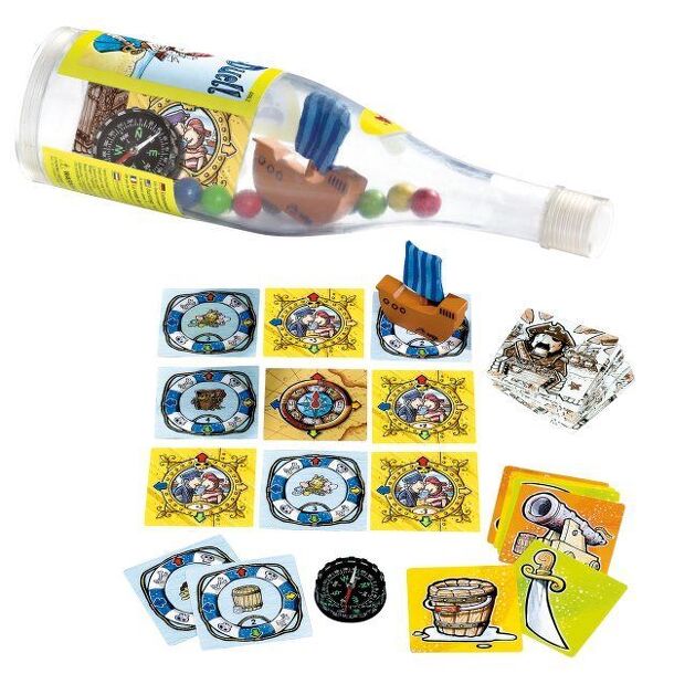 A push your luck game that is thick on theme. Game comes in a plastic bottle, which is used to not only contain the game, but to receive directions for the boat. Also features a working compass and a cute little boat with cloth sails. Colored balls are rattled around and brought to the transparent cap; these dictate ship movements and will allow a player...