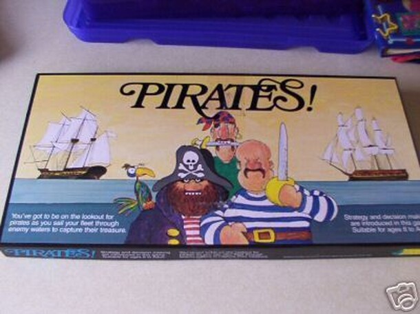 (From the box) "You've got to be on the lookout for pirates as you sail your fleet through enemy waters to capture their treasure" A battle game, with two players each having six pirate ships. The fleets maneuver through a board crowded with shoals and islands to capture their opponent's treasure and return it to base. Movement and combat resolved by die...