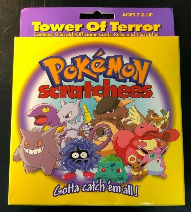 Pokémon psychic guessing game, with psychic, ghost, poison, grass, and normal Pokémon. "Gotta scratch 'em all!" In this scratch off game, two players scratch off a square in the pyramid, revealing Pokémon, Team Rocket, treasures, etc. Depending on the revealed icon, players get to scratch off other sections of the card. However collects the most Pokémon...