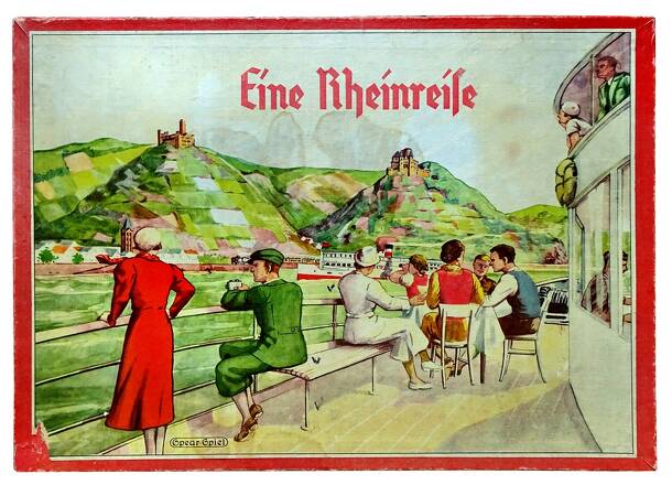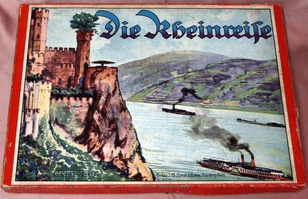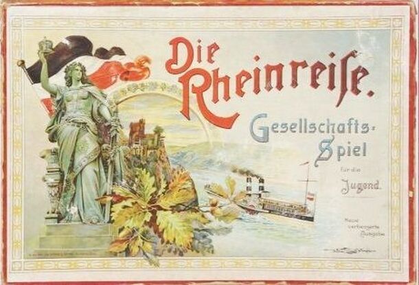 "Die Rheinreise. Gesellschafts-Spiel für die Deutsche Jugend. Neue verbesserte Ausgabe" - The journey along the Rhine. Board game for the German youth. New and improved edition. Object: be the first to reach target space crossing 100 numbered squares. Typical 'roll and move' game. special: along your way to the target you'll pick up tools (umbrella...