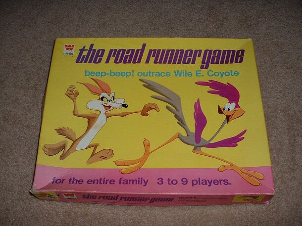 The Road Runner Game consists of a deck of cards and 8 flat cardboard cutout figures of The Road Runner and 1 Wile E. Coyote figure, both characters from the Warner Brothers cartoons. The cards are numbered and have brightly colored and patterned backgrounds (one background per set of numbered cards). The cutouts are about 10 inches tall. The Road Runner...