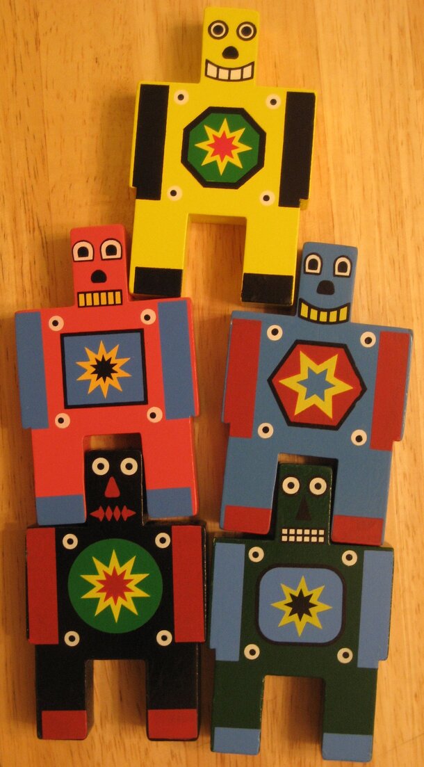 From the front of the box: Look out! Here come the robots - a troupe twenty strong! - on the way back to their spaceship after making many friends on earth. But now it's time for them to go home. Can you help them board their spaceship? It's very unsteady when it's parked on earth, and when they step onto it, they really rock the boat. It's so tippy that...