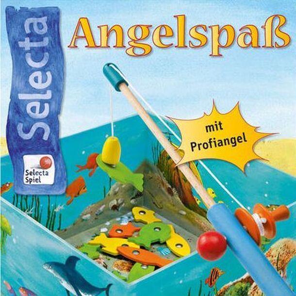 "The fishing game" exists in many versions with many sets of rules. To give an example of one such ruleset, the simplest version of Angelspaß from Selecta Spielzeug has players load the fishing area with the 18 magnetic fish. Players then take turns fishing with the rod, with each player having two chances to catch a fish and reel it out of the box, before...