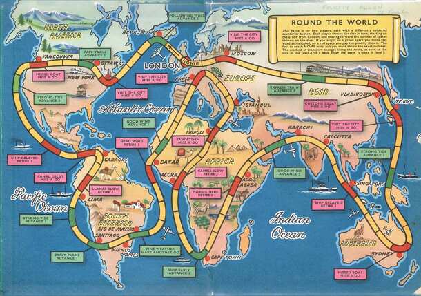 A Goose-type game, published in a book called More Games, Puzzles and Pastimes, published by Odhams Press in 1959. The rules: This game is for two players, each with a differently coloured counter or button. Each player throws the dice in turn, starting on the arrow from London, and moving forward the number of spaces thrown on the dice. If you alight on a...