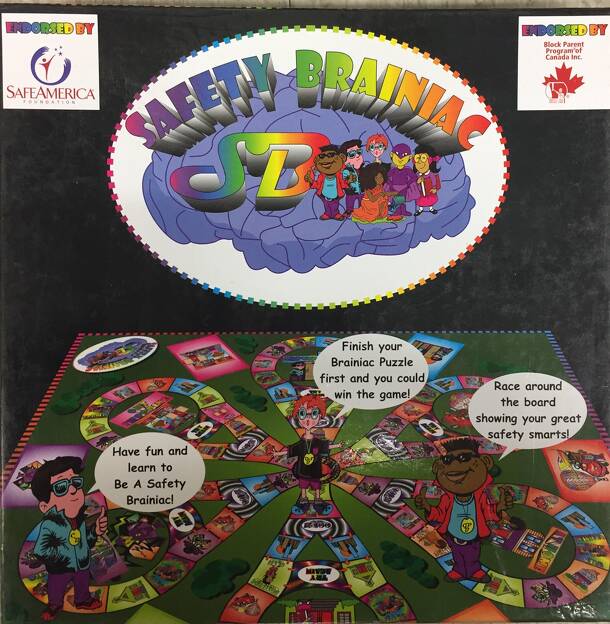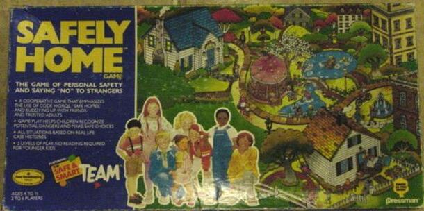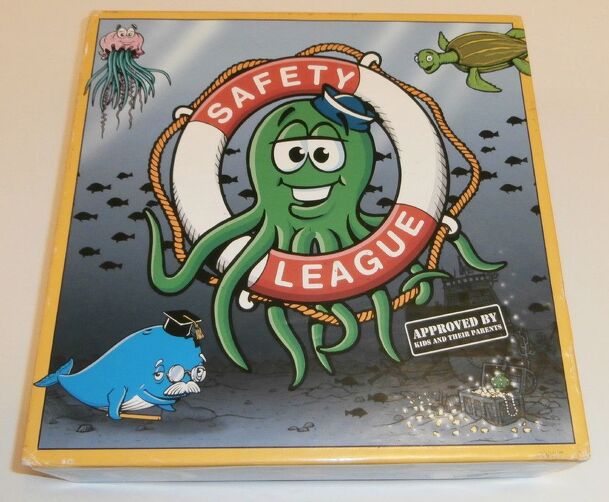 This is a children's game designed to teach younger kids about safety. Players move along a pathway and answer simple questions that offer educational information. The board is divided into zones, and each zone has a matching card deck: Neighborhood Safety School Safety Travel Safety Street Safety Home Safety Shopping Safety Internet Safety There is also...