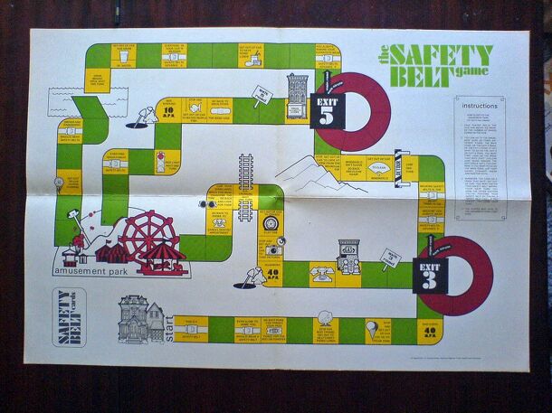 Published by the U.S. Department of Transportation to promote the use of seat belts. Each player rolls a die and moves along a track. the first player to get the amusement park wins. Some spaces are marked with hazards that cause the loss of a turn. Other spaces cause the player to get out the car. When movement resumes, a Safety Belt card must be drawn....