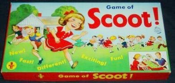 Scoots are ball bearings inside a plastic cone. Cone is big enough that ball bearing rolls inside the cone. There are two blue scoots, two red scoots, and one yellow scoot used as a target for the game Scoot. Scoots game package has three games: Scoots: Players shoot their "scoot" towards target and try to knock opponent out of the way. Closet to target...