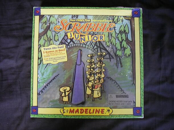 The Scrabble Junior Madeline edition features the adventurous little girl Madeline. She and her friends (Miss Clavel, Pepito and the eleven other girls) are out for a walk in the park. The board features pictures and the corresponding words for the people and things they encounter. Players earn one of Madeline's little yellow hats when they match their...