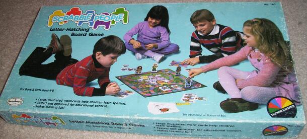 From the back of the box: Youngsters will enjoy this exciting race game. Players choose a word card from the 18 colorfully illustrated cards in this game and must match letter cards to complete their word. Everytime they spin the spinner and land on a matching colored space, they receive 1, 2 or 3 letter cards. The player who completes his 3 letter word...