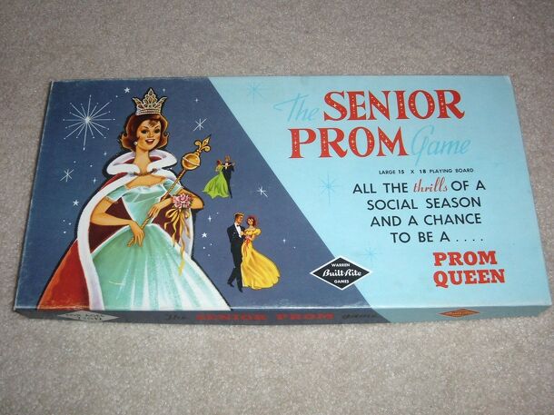 "All the thrills of a social season and a chance to be a .... Prom Queen" A very cheaply made game by 'Built Rite'. The Senior Prom Game is a simple roll and move game for children. The game board is made out of thin cardboard and features 2 different tracks to move around depending on an initial spin with the spinner. Even the playing tokens are made out...