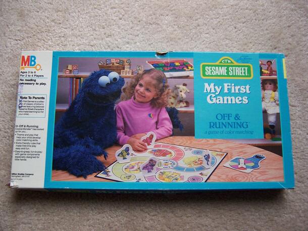 In this children's matching game players race to match all the cards of their color to items on their boards. Each player receives 2 boards depicting a Sesame Street scene with lots of characters and items. The item cards are mixed and placed face down within easy reach of both players. At the count of 3, each player simultaneously turns over a card. If...