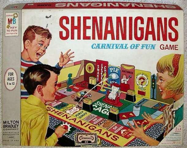 "Here it is, the fun-filled, play-at-home version of television's new game show for youngsters - SHENANIGANS. A fast moving game, that's easy to learn and exciting to play over and over again, Shenanigans is a race between players, with contests, penalties and surprises almost every step of the way. The game board is a 3 dimensional replica of the studio...