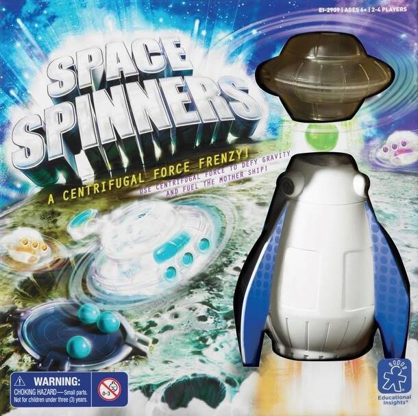 Players in Space Spinners need to be the first to load their fuel payload into the spaceship because if they do, they'll be the one to launch the ship and win. Each player has five colored fuel balls, a landing pad, and a "spinner ship". With everyone playing at once, players place one or more fuel balls on their landing pad, place their spinner ship over...