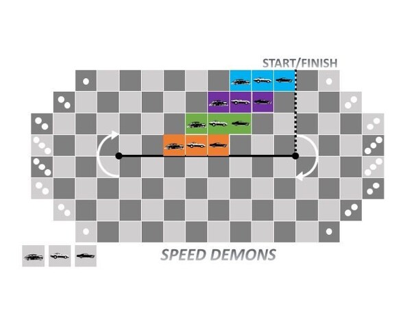 Speed Demons is a racing game for 2 - 4 players, ages 7+. Play time is about 20 min. 1 - 8 x 16 checkerboard 16 - Race Tiles, 3 per player in 1 of 4 colors The player who navigates all 3 of their race tiles around the track and across the finish line first, is declared the winner! Movement of pieces is controlled by numbers printed along rows and also by...