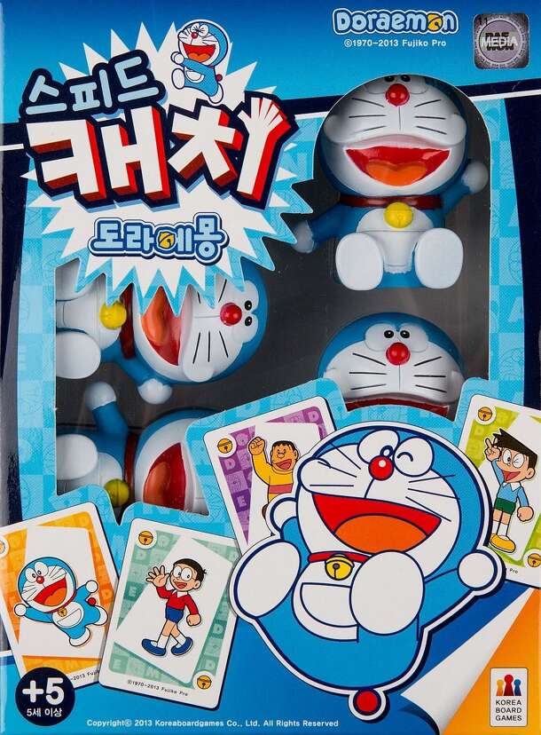 Doraemon is a robotic cat featured in a Japanese comic/animation series of the same title. The game comes with 5 Doraemon figures and 6 sets of 5 cards of the same color. When you play, you take Doraemon figures, one less then there are players, and put them in the middle where everybody can reach them. You take as many sets of colored cards as there are...