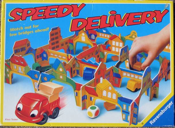 OBJECTIVE Each player tries to be first to transport four boxes out of town on his delivery wagon. Cute game for children. The dice tells you under what bridge you can move. Red bridges are very low and force you to lose your load. Yellow bridges are medium high and trucks will lose any boxes over the first. Green bridges are the highest and allow you to...