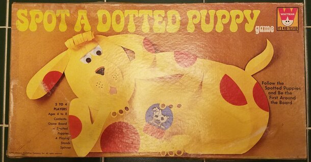 Contents: 4 Puppy Playing Pieces, Spinner, Game Board Object: To be the first player to return his puppy to his doghouse. Before Play: Each player selects a spotted puppy playing piece and places it on the matching doghouse. Blue puppy goes first. Play: First player spins the spinner and moves his puppy that number of spaces, counterclockwise around the...